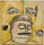 A figure stares ahead with hollow eyes as small animals crawl in and out of holes in the walls around him. This may or may not be happening.