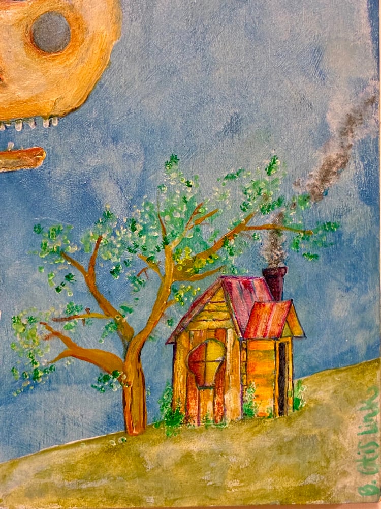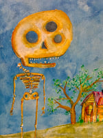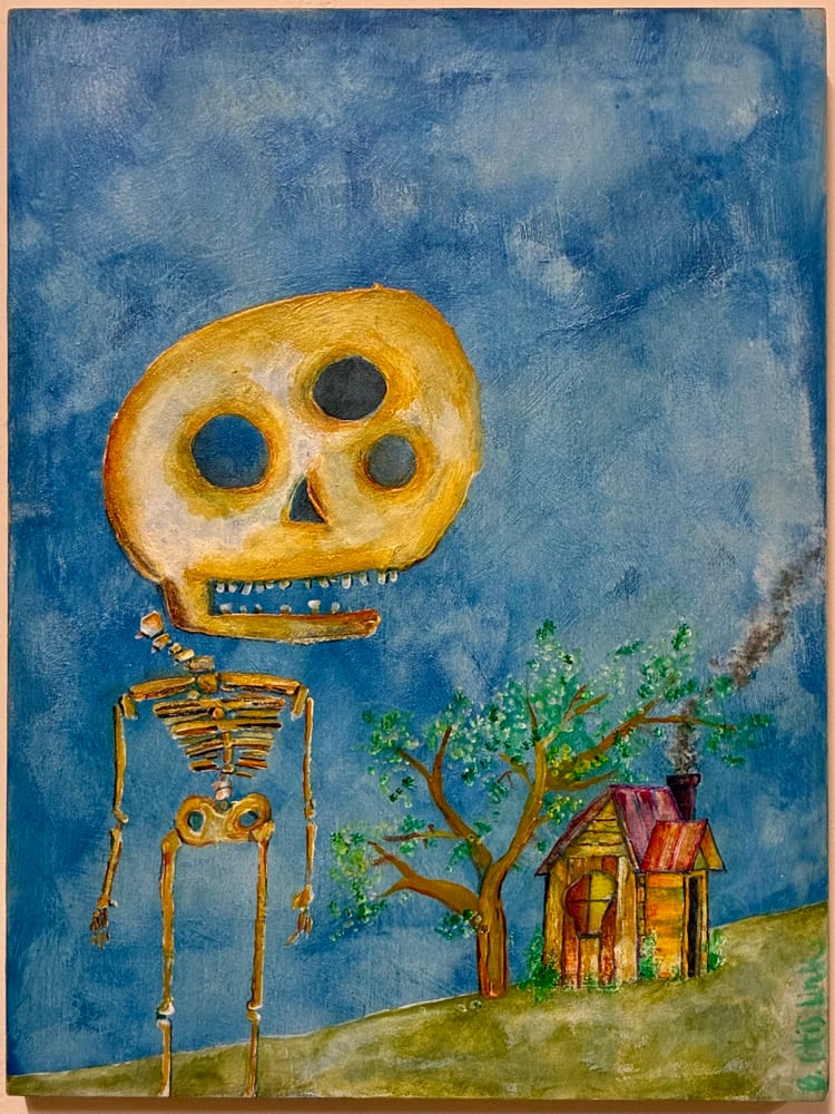 “Giant Bonehead” presents a towering skeletal figure with an exaggerated cranium, positioned quietly beside a humble wooden home and wind‑bent tree. The expansive blue sky, rendered with layered brushstrokes, creates an open yet uncanny atmosphere — amplifying the contrast between the intimate domestic structure and the looming, almost playful figure. The work balances whimsy and unease, inviting the viewer to consider the intersection of memory, mortality, and the absurd.