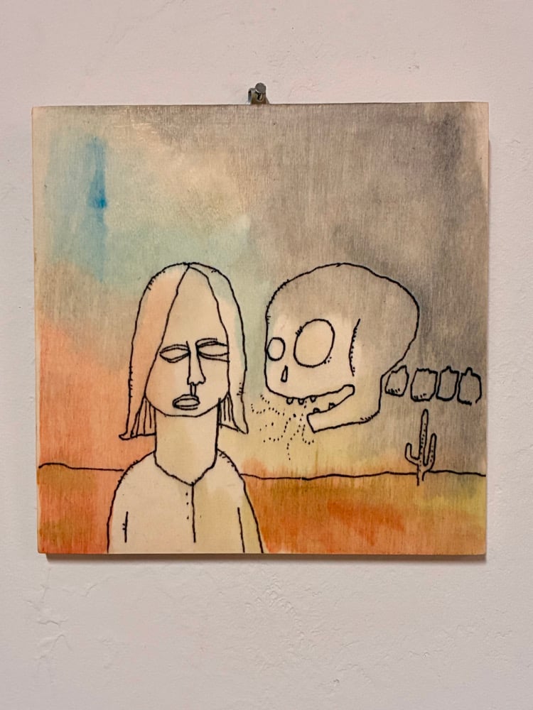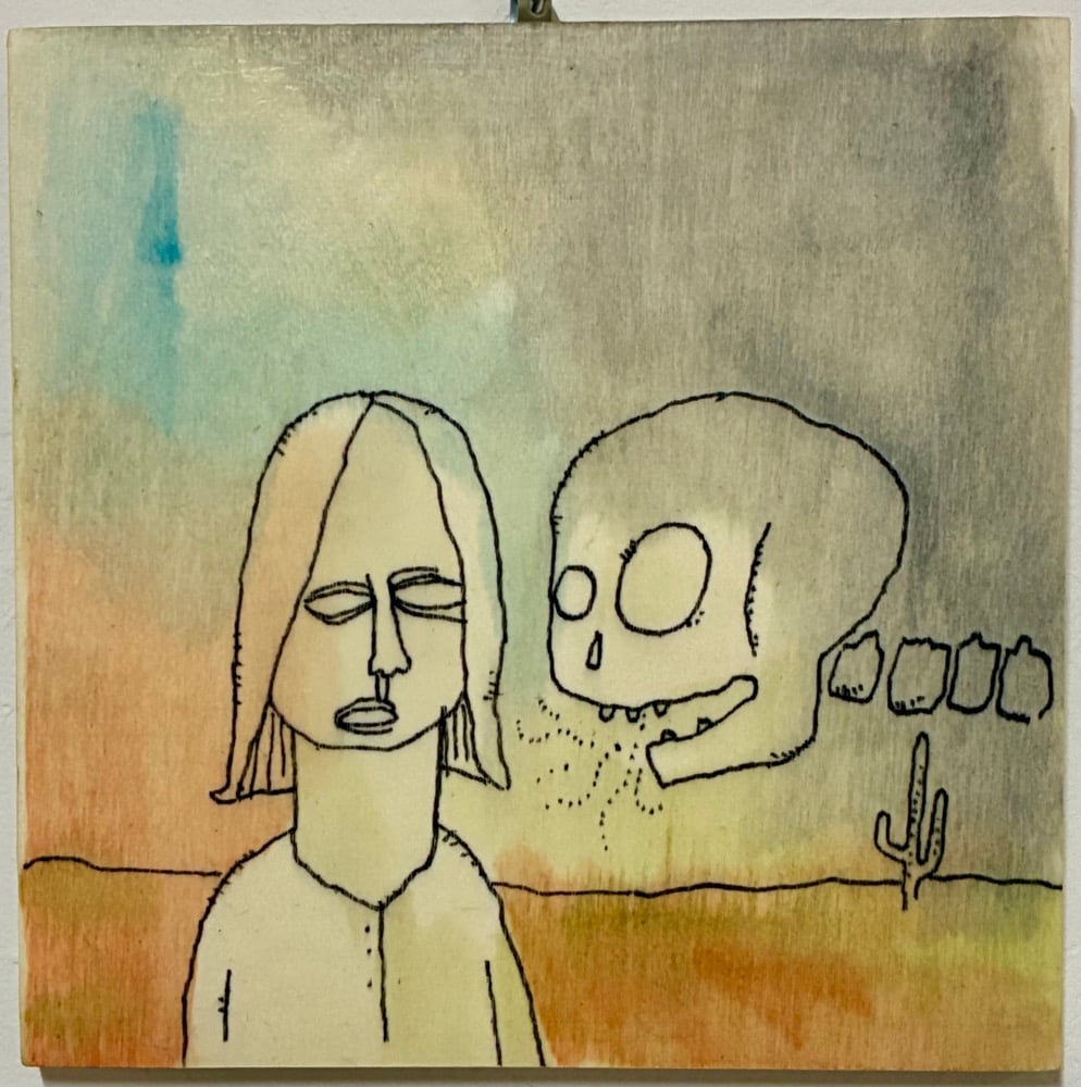 A calm figure stands in the desert. A floating skull with teeth drifts nearby. Neither seems to be concerned about this arrangement. The cactus in the distance is also there.