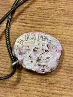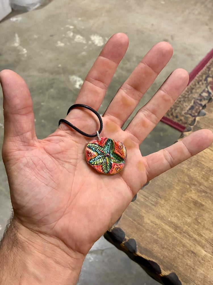 Molded with ceramic, cured, and painted. Leather loop included